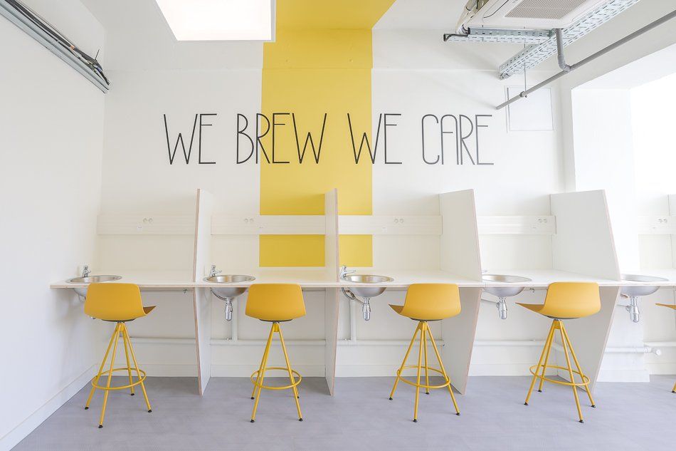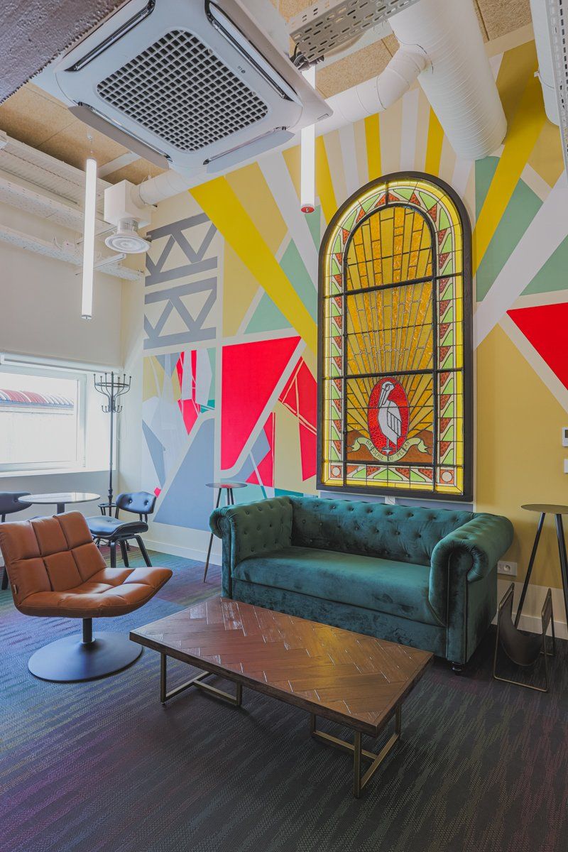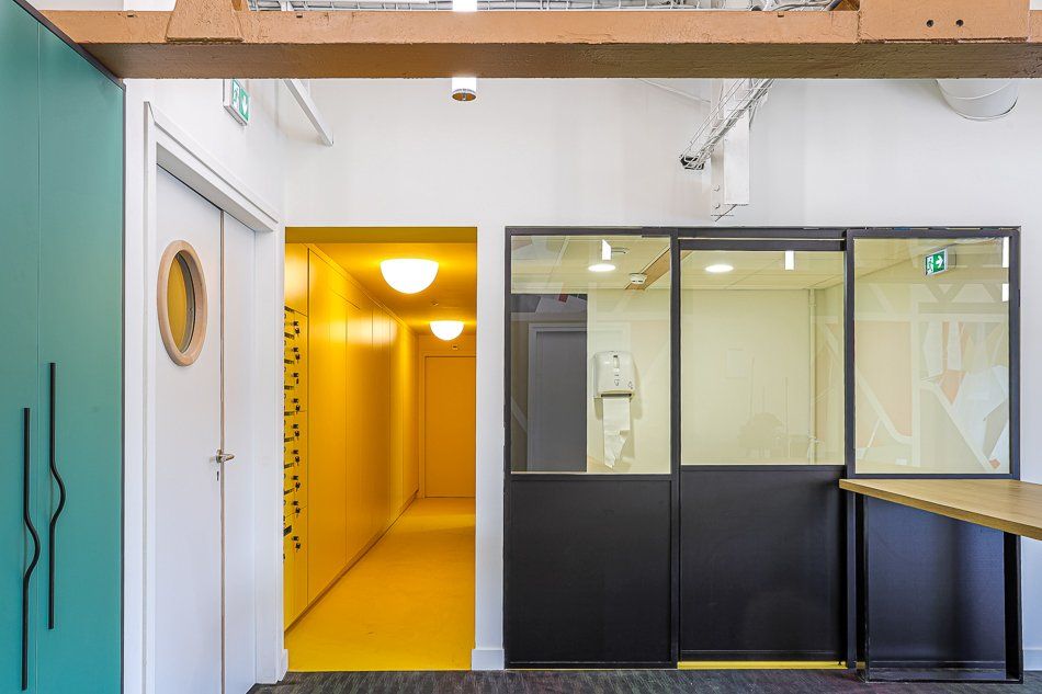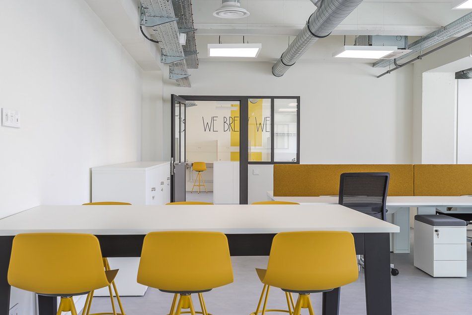 Ici, l’architecte du projet a souhaité jouer avec des couleurs chaudes, des pièces monochromes, des open space et une cafétéria haute en couleur équipée de mobiliers type bistrot.
